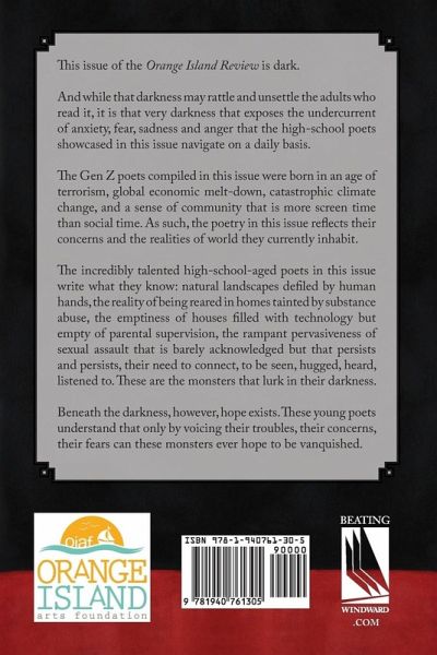 This issue of the Orange Island Review is dark. And while that darkness may rattle and unsettle the adults who read it, it is that very darkness that exposes the undercurrent of anxiety, fear, sadness and anger that the high-school poets showcased in this issue navigate on a daily basis. The Gen Z poets compiled in this issue were born in an age of terrorism, global economic melt-down, catastrophic climate change, and a sense of community that is more screen time than social time. As such, the poetry in this issue reflects their concerns and the realities of world they currently inhabit. The incredibly talented high-school-aged poets in this issue write what they know: natural landscapes defiled by human hands, the reality of being reared in homes tainted by substance abuse, the emptiness of houses filled with technology but empty of parental supervision, the rampant pervasiveness of sexual assault that is barely acknowledged but that persists and persists, their need to connect, to be seen, hugged, heard, listened to. These are the monsters that lurk in their darkness. Beneath the darkness, however, hope exists. These young poets understand that only by voicing their troubles, their concerns, their fears can these monsters ever hope to be vanquished.