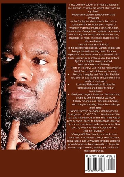 "I may bear the burden of a thousand futures in one morning, or simply the weight of my sons on my chest." Witness the Dawn of Empowerment and Revolution As the first light of dawn breaks the horizon, "Orange Will Rise" illuminates the path of resilience and transformation. Damont Combs, known as Mr. Orange Live, captures the essence of a new day with verses that awaken the soul, challenge the norm, and inspire readers to rise above adversity. Unleash Your Inner Strength In this electrifying collection, Damont guides you through the early morning hues of human experience. His words serve as a powerful call to action, urging you to embrace your true self and fight for a brighter, more just world. Discover the Power of PoetryRoots and Identity: Dive into the rich narratives that define us and celebrate our heritage. Personal Struggles and Triumphs: Feel the raw emotion and triumphs of overcoming life's toughest challenges. Love and Relationships: Explore the complexities and beauty of human connections. Family and Legacy: Reflect on the bonds that shape us and the legacies we leave. Society, Change, and Reflections: Engage with thought-provoking pieces that challenge and inspire. Damont Combs's accolades, including the RI Distinguished - CAFE S.O.U.L Gentleman of the Year and National Poet of The Year, Indie Author Legacy Award, speak to his impact and influence. His work has captivated audiences from the New York City Poetry Festival to Culture Fest RI. Join the Revolution " Orange Will Rise" is not just a book; it's a movement. A movement towards self-discovery, social justice, and unwavering strength. Damont's powerful words will resonate with you long after the last page is turned, inspiring you to rise and make a difference.