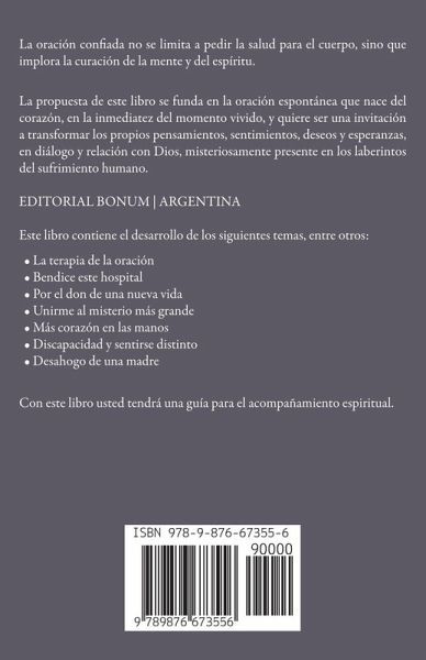 La oración confiada no se limita a pedir la salud para el cuerpo, sino que implora la curación de la mente y del espíritu. La propuesta de este libro se funda en la oración espontánea que nace del corazón, en la inmediatez del momento vivido, y quiere ser una invitación a transformar los propios pensamientos, sentimientos, deseos y esperanzas, en diálogo y relación con Dios, misteriosamente presente en los laberintos del sufrimiento humano. EDITORIAL BONUM ARGENTINA Este libro contiene el desarrollo de los siguientes temas, entre otros:La terapia de la oración Bendice este hospital Por el don de una nueva vida Unirme al misterio más grande Más corazón en las manos Discapacidad y sentirse distinto Desahogo de una madre Con este libro usted tendrá una guía para el acompañamiento espiritual.