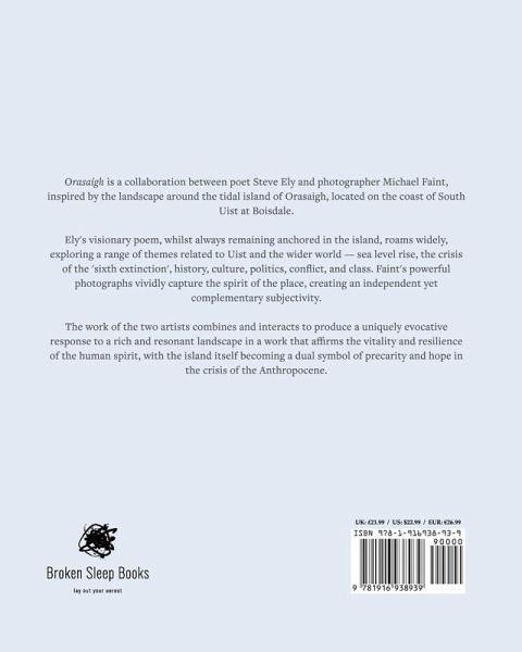 Orasaigh is a collaboration between poet Steve Ely and photographer Michael Faint, inspired by the landscape around the tidal island of Orasaigh, located on the coast of South Uist at Boisdale. Ely's visionary poem, whilst always remaining anchored in the island, roams widely, exploring a range of themes related to Uist and the wider world - sea level rise, the crisis of the 'sixth extinction', history, culture, politics, conflict, and class. Faint's powerful photographs vividly capture the spirit of the place, creating an independent yet complementary subjectivity. The work of the two artists combines and interacts to produce a uniquely evocative response to a rich and resonant landscape in a work that affirms the vitality and resilience of the human spirit, with the island itself becoming a dual symbol of precarity and hope in the crisis of the Anthropocene.