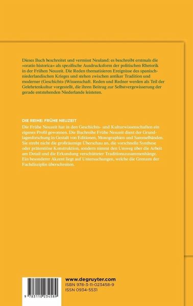 Dieses Buch beschreitet und vermisst Neuland, indem es die Entwicklung der oratio historica als spezifische Ausdrucksform der politischen Rhetorik in der frühen Neuzeit beschreibt, die ihre Wurzeln in der Antike hat und zugleich an der Schwelle der modernen (Geschichts-)Wissenschaft steht. Im Kontext des niederländisch-spanischen Unabhängigkeitskrieges entstand eine lebendige Redekultur, in der die orationes historicae Teil der aktuellen epideiktischen oder memorialen Diskurse wurden und das Selbstverständnis der Konfliktparteien reflektieren. Mit der Ausleuchtung rhetorikgeschichtlicher Traditionsstränge ist die Analyse von einzelnen Reden, intertextuellen Zusammenhängen und die Verortung in der frühneuzeitlichen Gelehrtenkultur verknüpft. Redner und Reden aus den nach Unabhängigkeit strebenden Provinzen werden solchen der spanisch gebliebenen Provinzen vergleichend gegenübergestellt und in eine diachron angelegte Darstellung geordnet. Variationen und Transformationen des rhetorischen Reportoires werden erhellt, ebenso das kreative Spannungsfeld von Rhetorik und Geschichtsschreibung. Ein Corpus von ca. 80 Reden und ihren Autoren wird dem Leser im Anhang bio-bibliographisch erschlossen. Es bietet zahlreiche Anknüpfungspunkte für weitere Forschungen.
