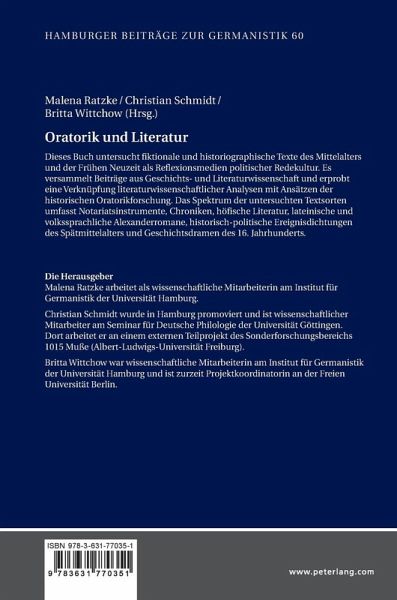 Dieses Buch untersucht fiktionale und historiographische Texte des Mittelalters und der Frühen Neuzeit als Reflexionsmedien politischer Redekultur. Es versammelt Beiträge aus Geschichts- und Literaturwissenschaft und erprobt eine Verknüpfung literaturwissenschaftlicher Analysen mit Ansätzen der historischen Oratorikforschung. Das Spektrum der untersuchten Textsorten umfasst Notariatsinstrumente, Chroniken, höfische Literatur, lateinische und volkssprachliche Alexanderromane, historisch-politische Ereignisdichtungen des Spätmittelalters und Geschichtsdramen des 16. Jahrhunderts.