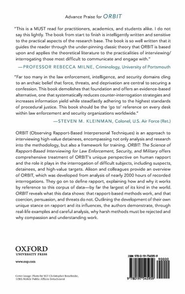 ORBIT (Observing Rapport Based Interpersonal Techniques) is an approach to interviewing high-value detainees, encompassing not only analysis and research into the methodology, but also a framework for training. ORBIT: The Science of Rapport-Based Interviewing for Law Enforcement, Security, and Military offers comprehensive treatment of ORBIT's unique perspective on human rapport and the role it plays in the interrogation of difficult subjects, including suspects, detainees, and high value targets. Alison and colleagues provide an overview of ORBIT, which was developed from analysis of nearly 2000 hours of recorded interrogations. They go on to define rapport, explaining how and why it works by reference to this corpus of data--by far the largest of its kind in the world. ORBIT reveals what this data shows: that rapport-based methods work, and that coercion, persuasion, and threats do not. Outlining the development of their own unique stance on rapport and its influences, the authors demonstrate, through real-life examples and careful analysis, why harsh methods must be rejected and why compassion and understanding work.