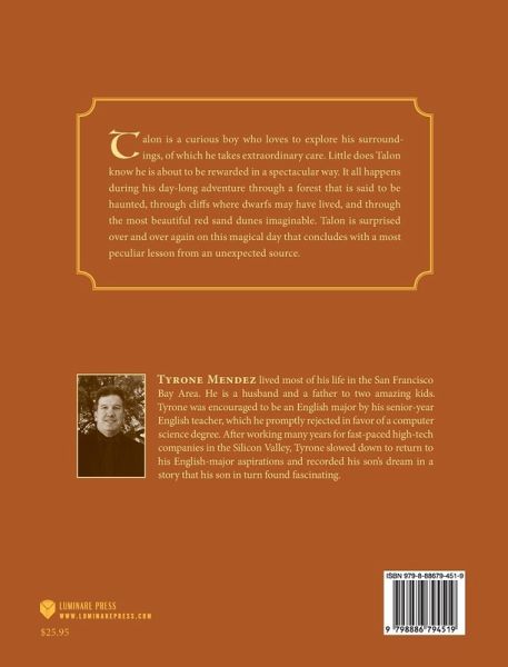 Talon is a curious boy who loves to explore his surroundings, of which he takes extraordinary care. Little does Talon know he is about to be rewarded in a spectacular way. It all happens during his day-long adventure through a forest that is said to be haunted, through cliffs where dwarfs may have lived, and through the most beautiful red sand dunes imaginable. Talon is surprised over and over again on this magical day that concludes with a most peculiar lesson from an unexpected source.