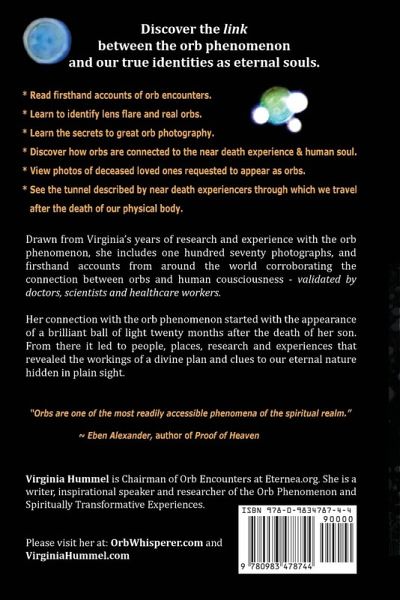 Discover the link between the orb phenomenon and our true identities as eternal souls Read firsthand accounts of orb encounters. Learn the secrets of great orb photography. Learn to identify the difference between lens flare and real orbs. Discover how orbs are connected to near-death experiences and the human soul. View photographs of deceased loved ones requested to appear as orbs. See photographs of the tunnel described by near-death experiencers through which we travel after the death of our physical body. Drawn from Virginia's years of research and experience with the orb phenomenon, she includes over one hundred-sixy photographs, and stories from around the world corroborating this connection-validated by doctors, scientists and healthcare workers. Her connection with the orb phenomenon started with the appearance of a brilliant ball of light or orb, twenty months after the death of her son. From there, it led to people, places, research and experiences that revealed the workings of a divine plan and clues to our eternal nature hidden in plain sight. VIRGINIA M. HUMMEL is the Chairman of Orb Encounters at Eternea.org. She is a writer, inspirational speaker and researcher on Spiritually Transformative Experiences and the Orb Phenomenon.