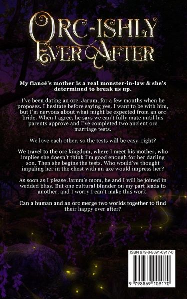 My fiancé's mother is a real monster-in-law & she's determined to break us up. I've been dating an orc, Jarum, for a few months when he proposes. I hesitate before saying yes. I want to be with him, but I'm nervous about what might be expected from an orc bride. When I agree, he says we can't fully mate until his parents approve and I've completed two ancient orc marriage tests. We love each other, so the tests will be easy, right? We travel to the orc kingdom, where I meet his mother, who implies she doesn't think I'm good enough for her darling son. Then she begins the tests. Who would've thought impaling her in the chest with an axe would impress her? As soon as I please Jarum's mom, he and I will be joined in wedded bliss. But one cultural blunder on my part leads to another, and I worry I can't make this work. Can a human and an orc merge two worlds together to find their happy ever after?