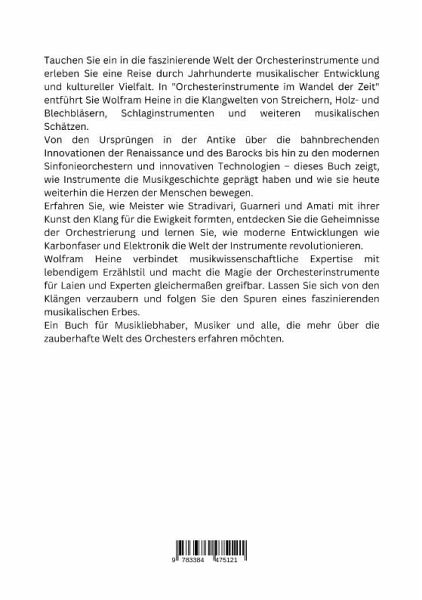 Tauchen Sie ein in die faszinierende Welt der Orchesterinstrumente und erleben Sie eine Reise durch Jahrhunderte musikalischer Entwicklung und kultureller Vielfalt. In "Orchesterinstrumente im Wandel der Zeit" entführt Sie Wolfram Heine in die Klangwelten von Streichern, Holz- und Blechbläsern, Schlaginstrumenten und weiteren musikalischen Schätzen.Von den Ursprüngen in der Antike über die bahnbrechenden Innovationen der Renaissance und des Barocks bis hin zu den modernen Sinfonieorchestern und innovativen Technologien - dieses Buch zeigt, wie Instrumente die Musikgeschichte geprägt haben und wie sie heute weiterhin die Herzen der Menschen bewegen.Erfahren Sie, wie Meister wie Stradivari, Guarneri und Amati mit ihrer Kunst den Klang für die Ewigkeit formten, entdecken Sie die Geheimnisse der Orchestrierung und lernen Sie, wie moderne Entwicklungen wie Karbonfaser und Elektronik die Welt der Instrumente revolutionieren.Wolfram Heine verbindet musikwissenschaftliche Expertise mit lebendigem Erzählstil und macht die Magie der Orchesterinstrumente für Laien und Experten gleichermaßen greifbar. Lassen Sie sich von den Klängen verzaubern und folgen Sie den Spuren eines faszinierenden musikalischen Erbes.Ein Buch für Musikliebhaber, Musiker und alle, die mehr über die zauberhafte Welt des Orchesters erfahren möchten.
