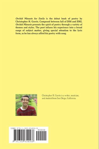 Orchid Minuets for Emily is the debut book of poetry by Christopher Gorrie. Composed between Fall 2011 and Fall 2012, Orchid Minuets presents the spirit of poetry through a variety of themes and style. The poet infuses his experience into a broad range of subject matter, giving special attention to the lyric form, as he has always allied his poetry with song.