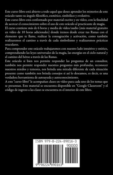 Este curso-libro está abierto a todo aquel que desee aprender los misterios de este oráculo tanto su ángulo filosófico, esotérico, simbólico y evolutivo. Este curso-libro está conformado por material escrito y en vídeo, con la finalidad de acercar el conocimiento sobre el uso de este oráculo al practicante de magia. El curso contiene más de 6 horas y media de vídeo/audio (mas material gratuito en vídeo de 10 horas adicional) donde iremos desde crear tus Runas con el elemento que te llame, realizar la consagración y activación, como también realizaremos el camino a través de cada simbolismo y realizaremos prácticas oraculares. Para comprender este oráculo trabajaremos con nuestro lado intuitivo y onírico, comprendiendo las leyes universales de la magia, las energías en el ciclo natural y el camino del héroe a través de las Runas. Este oráculo si bien nos permite responder las preguntas de un consultante, también nos permite responder nuestras preguntas más profundas, reconocer nuestros miedos y temores, nos brinda una mirada diferente de cada situación presente como también nos brinda consejos si así lo deseamos, es decir, es una verdadera herramienta de auto-ayuda y auto-conocimiento. A este "curso-libro" le acompañan clases en vídeo para cada uno de los temas que se presentan. Este material se encuentra disponible en "Google Clasroom" y el código de ingreso a las clases se encuentra en el interior de este libro.