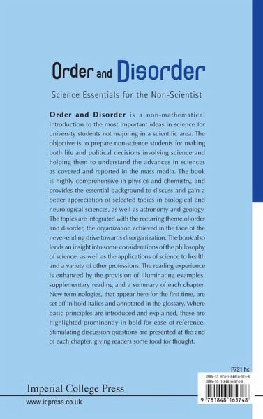 Order and Disorder is a non-mathematical introduction to the most important ideas in sciences for university students not majoring in a scientific area. The objective is to prepare non-science students to make life and political decisions involving science and to understand the advances in sciences as covered and reported in the mass media. The book is significantly comprehensive in physics and chemistry, providing the essential background to discuss and gain a better appreciation of selected topics in biological and neurological sciences, as well as astronomy and geology. The topics are integrated with the recurring theme of order and disorder the organization achieved in the face of its never-ending drive towards disorganization. The book also lends an insight into some considerations in the philosophy of science, as well as the applications of science to health and to a variety of professions. Reading experience is enhanced by the provisions of illuminating examples, supplementary readings and a summary for each chapter. New terminologies, that appear for the first time in the content, are set off in bold italics and annotated in the glossary. Where basic principles are introduced and explained, these are highlighted prominently in bold for ease of reference. Stimulating discussion questions are presented at the end of each chapter, giving readers some food for thought.