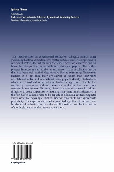 This thesis focuses on experimental studies on collective motion using swimming bacteria as model active-matter systems. It offers comprehensive reviews of state-of-the-art theories and experiments on collective motion from the viewpoint of nonequilibrium statistical physics. The author presents his experimental studies on two major classes of collective motion that had been well studied theoretically. Firstly, swimming filamentous bacteria in a thin fluid layer are shown to exhibit true, long-range orientational order and anomalously strong giant density fluctuations, which are considered…mehr