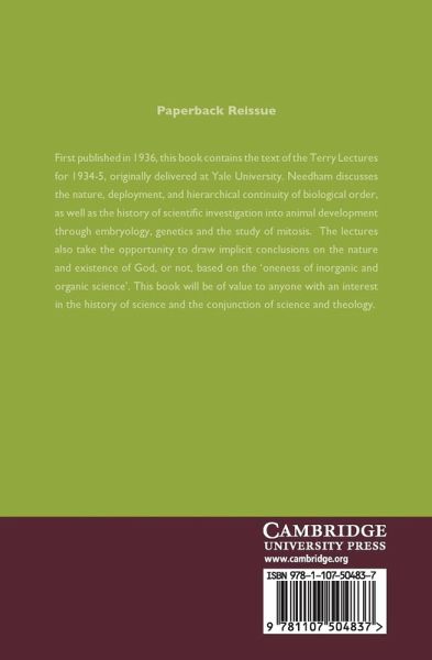 First published in 1936, this book contains the text of the Terry Lectures for 1934-5, originally delivered at Yale University. Needham discusses the nature, deployment, and hierarchical continuity of biological order, as well as the history of scientific investigation into animal development through embryology, genetics and the study of mitosis. The lectures also take the opportunity to draw implicit conclusions on the nature and existence of God, or not, based on the 'oneness of inorganic and organic science'. This book will be of value to anyone with an interest in the history of science and the conjunction of science and theology.