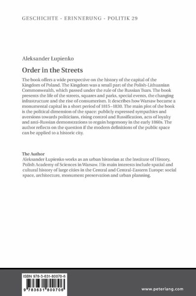 The book offers a wide perspective on the history of the capital of the Kingdom of Poland. The Kingdom was a small part of the Polish-Lithuanian Commonwealth, which passed under the rule of the Russian Tsars. The book presents the life of the streets, squares and parks, special events, the changing infrastructure and the rise of consumerism. It describes how Warsaw became a monumental capital in a short period of 1815-1830. The main plot of the book is the political dimension of the space: publicly expressed sympathies and aversions towards politicians, rising control and Russification, acts of loyalty and anti-Russian demonstrations to regain hegemony in the early 1860s. The author reflects on the question if the modern definitions of the public space can be applied to a historic city.