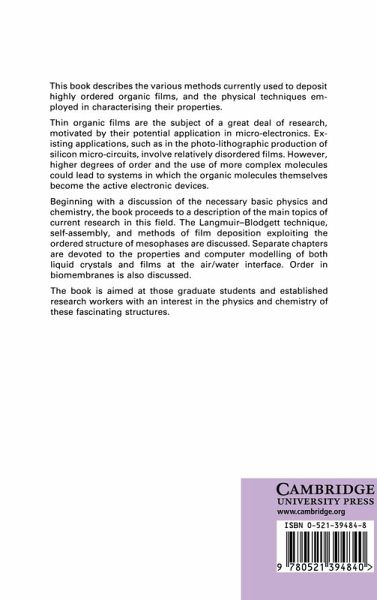 This book describes the various methods currently used to deposit highly ordered organic films, and the physical techniques employed in characterising their properties. Such films are the subject of a great deal of research, motivated by their potential application in micro-electronics. Beginning with a discussion of the necessary basic physics and chemistry, the book proceeds to a description of the main topics of current research in this field. The Langmuir-Blodgett technique, self-assembly, and methods of film deposition exploiting the ordered structure of mesophases are described in detail. Liquid crystals, films at the air/water interface and biomembranes are also discussed. The book is aimed at those graduate students and established research workers with an interest in the physics and chemistry of these fascinating structures.