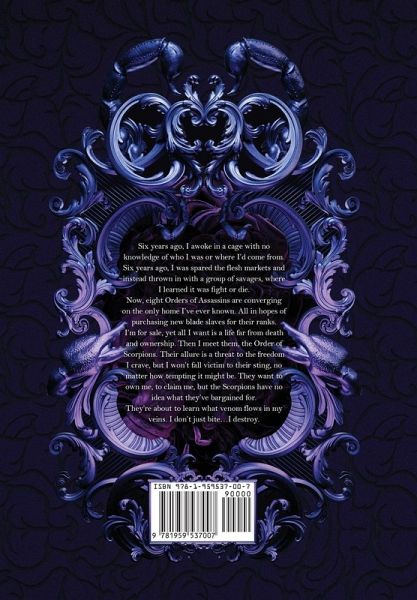 Six years ago, I awoke in a cage with no knowledge of who I was or where I'd come from. Six years ago, I was spared the flesh markets and instead thrown in with a group of savages, where I learned it was fight or die. Now, eight Orders of Assassins are converging on the only home I've ever known. All in hopes of purchasing new blade slaves for their ranks. I'm for sale, yet all I want is a life far from death and ownership. Then I meet them, the Order of Scorpions. Their allure is a threat to the freedom I crave, but I won't fall victim to their sting, no matter how tempting it might be. They want to own me, to claim me, but the Scorpions have no idea what they've bargained for. They're about to learn what venom flows in my veins. I don't just bite...I destroy. This book is a dark fantasy romance. It contains graphic violence, strong language, explicit romance, and other content that could be triggering. Please see the author's note inside for a more detailed description of content concerns. Order of Scorpions is a Why Choose standalone story.