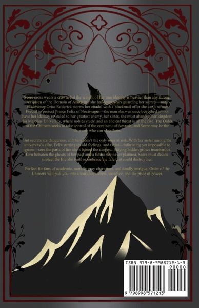 Seere Cross wears a crown, but the weight of her true identity is heavier than any throne. As queen of the Domain of Assassins, she has spent years guarding her secrets-until headmaster Orias Roderick storms her citadel with a blackmail offer she can't refuse. Forced to protect Prince Felix of Noctivagus-the man she was once betrothed to-or have her identity revealed to her greatest enemy, her sister, she must abandon her kingdom for Malphas University, where nobles study, and an ancient threat is on the rise. The Order of the Chimera seeks to take control of the continent of Aevrath, and Seere may be the only one who can stop them.But secrets are dangerous, and hers aren't the only ones at risk. With her sister among the university's elite, Felix stirring up old feelings, and Orias-infuriating yet impossible to ignore-sees the parts of her she's buried deepest. Staying hidden grows treacherous. Torn between the ghosts of her past and a future she never planned, Seere must decide: protect the life she built or embrace the fate that could destroy her.Perfect for fans of dark academia, morally gray characters, and deadly intrigue, Order of the Chimera will pull you into a world of secrets, sacrifice, and the price of power.