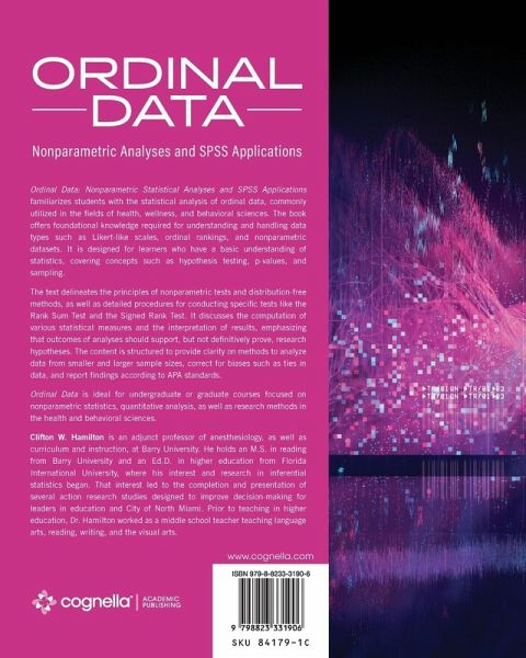 Ordinal Data: Nonparametric Statistical Analyses and SPSS Applications familiarizes students with the statistical analysis of ordinal data, commonly utilized in the fields of health, wellness, and behavioral sciences. The book offers foundational knowledge required for understanding and handling data types such as Likert-like scales, ordinal rankings, and nonparametric datasets. It is designed for learners who have a basic understanding of statistics, covering concepts such as hypothesis testing, p-values, and sampling. The text delineates the principles of nonparametric tests and distribution-free methods, as well as detailed procedures for conducting specific tests like the Rank Sum Test and the Signed Rank Test. It discusses the computation of various statistical measures and the interpretation of results, emphasizing that outcomes of analyses should support, but not definitively prove, research hypotheses. The content is structured to provide clarity on methods to analyze data from smaller and larger sample sizes, correct for biases such as ties in data, and report findings according to APA standards. Ordinal Data is ideal for undergraduate or graduate courses focused on nonparametric statistics, quantitative analysis, as well as research methods in the health and behavioral sciences.