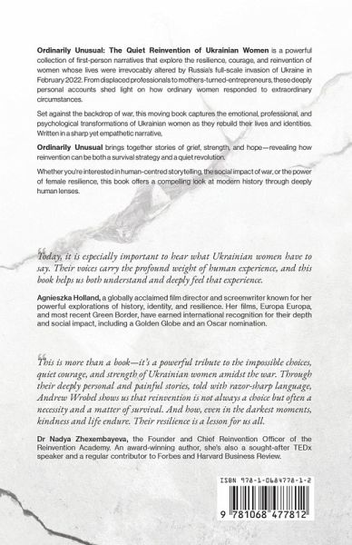 Ordinarily Unusual: The Quiet Reinvention of Ukrainian Women is a powerful collection of first-person narratives that explore the resilience, courage, and reinvention of women whose lives were irrevocably altered by Russia's full-scale invasion of Ukraine in February 2022. From displaced professionals to mothers-turned-entrepreneurs, these deeply personal accounts shed light on how ordinary women responded to extraordinary circumstances. Set against the backdrop of war, this moving book captures the emotional, professional, and psychological transformations of Ukrainian women as they rebuild their lives and identities. Written in a sharp yet empathetic narrative, Ordinarily Unusual brings together stories of grief, strength, and hope-revealing how reinvention can be both a survival strategy and a quiet revolution. Whether you're interested in human-centred storytelling, the social impact of war, or the power of female resilience, this book offers a compelling look at modern history through deeply human lenses.