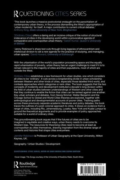 "All cities are ordinary, argues Robinson, and categorizing them as Western, Third World, developed, developing, world, or global ascribes prominence to certain cities and to certain features of cities. Instead, she starts from the fact that all cities are dynamic and diverse, if conflicted, arenas for social and economic life and anchors on that notion a new post-colonial framework for thinking about cities that avoids the underlying assumption of urban scholarship that Western cities are exemplary and Third World cities more or less poor imitations." --Reference & Research Book News