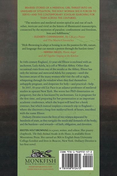 "Braided medieval and modern stories of an anchoress, her handmaiden, and the adjunct professor searching for them across centuries as they each navigate ambition, confinement, and the patriarchy. Twelve-year-old Elinor is enclosed with an anchoress, Lady Adela, in a cell at Wenlock Abbey, 14th-century England. Centuries later, an adjunct professor of medieval studies discovers Elinor's long-lost book of hours on a research trip to England. Holt-Browning explores women's timeless struggle for personal agency as her unforgettable characters discover the burdens and rewards of faith and devotion. A must-read for fans of Julian of Norwich"--
