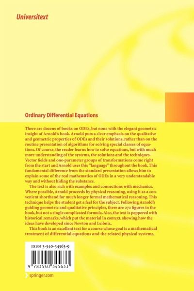 "Vladimir Arnold's is a master, not just of the technical realm of differential equations but of pedagogy and exposition as well. ... The writing throughout is crisp and clear. ... Arnold's says that the book is based on a year-long sequence of lectures for second-year mathematics majors in Moscow. In the U.S., this material is probably most appropriate for advanced undergraduates or first-year graduate students."