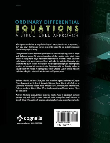 When Feynman was asked how he thought he should approach teaching in the classroom, his response was, "I don't know, really!" What he meant was there is no standard protocol that one can build to manage and disseminate the principles of learning. Ordinary Differential Equations: A Structured Approach provides an interactive, step-by-step guide to the complex world of differential equations. This text doesn't simply focus on finding a particular solution. Instead, it places emphasis on helping students analyze and understand the importance of the solution's context. Each solution method presented in this book is structured and distinct, which makes the classification of the equation just as important as the solution. A variety of examples are utilized to create an engaging and interesting reading experience, and encourage lively classroom discussion. Concept check-points and challenging problems are included throughout to facilitate the learning process. Ordinary Differential Equations combines theory and applications, making this a useful text for both Mathematics and Engineering majors. Snehanshu Saha, Ph.D. was born in Calcutta, India, where he completed degrees in Mathematics and Computer Science. He went on to earn his Masters in Mathematical Sciences at Clemson University and his Ph.D. from the Department of Mathematics at University of Texas at Arlington in 2008. After working briefly at his Alma matter, Snehanshu moved to the University of Texas El Paso, where he currently teaches Differential equations, Calculus and Linear Algebra. Apart from Mathematical research, Snehanshu takes a keen interest in Physics. He is a passionate teacher and encourages young people to study the sciences. He's actively involved in undergraduate research initiatives at the University of Texas El Paso, working with young minds and motivating them to pursue careers in higher mathematics.