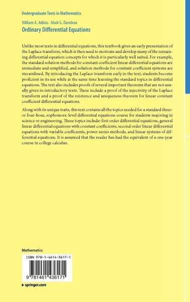 Unlike most texts in differential equations, this textbook gives an early presentation of the Laplace transform, which is then used to motivate and develop many of the remaining differential equation concepts for which it is particularly well suited. For example, the standard solution methods for constant coefficient linear differential equations are immediate and simplified, and solution methods for constant coefficient systems are streamlined. By introducing the Laplace transform early in the text, students become proficient in its use while at the same time learning the standard topics in differential equations. The text also includes proofs of several important theorems that are not usually given in introductory texts. These include a proof of the injectivity of the Laplace transform and a proof of the existence and uniqueness theorem for linear constant coefficient differential equations.
