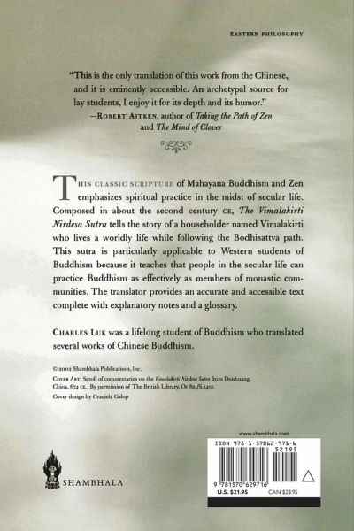 This classic scripture of Mahayana Buddhism and Zen emphasizes spiritual practice in the midst of secular life. Composed in about the second century CE, The Vimalakirti Nirdesa Sutra tells the story of a householder named Vimalakirti who lived a worldly life while following the Bodhisattva path. This sutra is particularly applicable to Western students of Buddhism because it teaches that people in the secular life can practice Buddhism as effectively as members of monastic communities. The translator provides an accurate and accessible text complete with explanatory notes and a glossary.