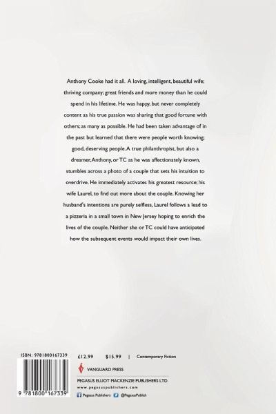 Anthony Cooke had it all. A loving, intelligent, beautiful wife; thriving company; great friends and more money than he could spend in his lifetime. He was happy, but never completely content as his true passion was sharing that good fortune with others; as many as possible. He had been taken advantage of in the past but learned that there were people worth knowing; good, deserving people. A true philanthropist, but also a dreamer, Anthony, or TC as he was affectionately known, stumbles across a photo of a couple that sets his intuition to overdrive. He immediately activates his greatest resource; his wife Laurel, to find out more about the couple. Knowing her husband's intentions are purely selfless, Laurel follows a lead to a pizzeria in a small town in New Jersey hoping to enrich the lives of the couple. Neither she or TC could have anticipated how the subsequent events would impact their own lives.