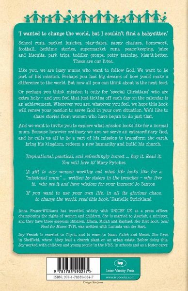 I wanted to change the world, but I couldn't find a babysitter.' School runs, packed lunches, play-dates, date night, nappy changes, homework, football, deadlines, bedtime stories, supermarket runs, peace-keeping, juice and biscuits, park trips, the runs, toddler groups, coffee drinking, mum's taxi, potty training, kiss-it-better. These are our lives. Like you, we are busy mums who want to follow God. We want to be part of his mission to the world. Perhaps you had big dreams of how you'd make a difference to the world, how you'd change it for the better. But now all you can think about is the next feed. Or perhaps you think mission is only for 'special Christians' who are extra holy and know their Bible backwards - and you feel that just ticking off each day on the calendar is an achievement. Wherever you are, whatever you feel, we hope this book will renew your passion to serve God in your own situation. We'd like to share some stories from women who have begun to do just that. And we want to invite you to explore what mission looks like for a normal mum. Because however ordinary we are, we serve an extraordinary God, and he calls us all to be a part of his mission to transform the earth, bring his kingdom, redeem a new humanity and build his church.