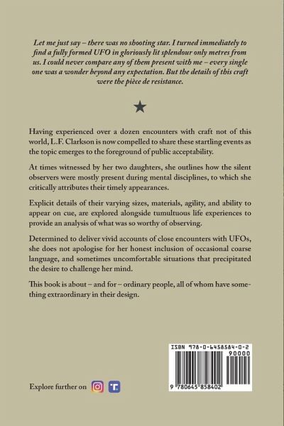 Having experienced over a dozen encounters with craft not of this world, Lisey Clarkson is now compelled to share these startling events as the topic emerges to the foreground of public acceptability. At times witnessed by her two daughters, she outlines how the silent observers were mostly present during mental disciplines, to which she critically attributes their timely appearances. Explicit details of their varying sizes, materials, agility, and ability to appear on cue, are explored alongside tumultuous life experiences to provide an analysis of what was so worthy of observing. Determined to deliver vivid accounts of close encounters with UFOs, she does not apologise for her honest inclusion of occasional coarse language, and sometimes uncomfortable situations that precipitated the desire to challenge her mind. This book is about - and for - ordinary people, all of whom have something extraordinary in their design.