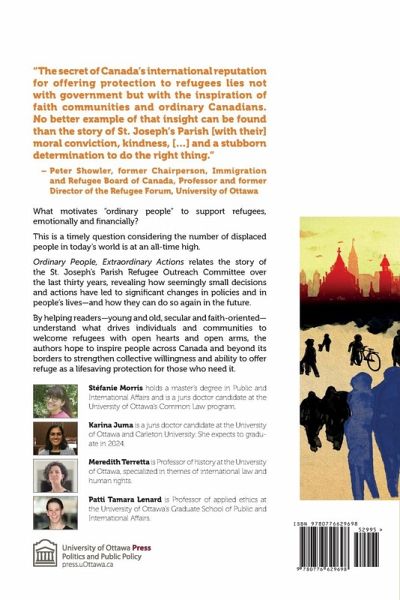 What motivates "ordinary people" to support refugees emotionally and financially? This is a timely question considering the number of displaced people in today's world is at an all-time high. To help counter this crisis, it is imperative for the Canadian government to determine which policies encourage volunteers to welcome asylum seekers, and which ones must be reviewed. Ordinary People, Extraordinary Actions relates the story of the St. Joseph's Parish Refugee Outreach Committee over its thirty years in action, revealing how seemingly small decisions and actions have led to significant changes in policies and in people's lives-and how they can do so again in the future. By helping readers-young and old, secular and faith-oriented-understand what drives individuals and communities to welcome refugees with open hearts and open arms, the authors hope to inspire people across Canada and beyond its borders to strengthen collective willingness and ability to offer refuge as a lifesaving protection for those who need it.