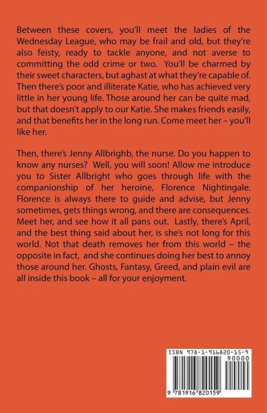 Between these covers, you'll meet the ladies of the Wednesday League, who may be frail and old, but they're also feisty, ready to tackle anyone, and not averse to committing the odd crime or two. You'll be charmed by their sweet characters, but aghast at what they're capable of. Then there's poor and illiterate Katie, who has achieved very little in her young life. Those around her can be quite mad, but that doesn't apply to our Katie. She makes friends easily, and that benefits her in the long run. Come meet her - you'll like her. Then, there's Jenny Allbrighb, the nurse. Do you happen to know any nurses? Well, you will soon! Allow me introduce you to Sister Allbright who goes through life with the companionship of her heroine, Florence Nightingale. Florence is always there to guide and advise, but Jenny sometimes, gets things wrong, and there are consequences. Meet her, and see how it all pans out. Lastly, there's April, and the best thing said about her, is she's not long for this world. Not that death removes her from this world - the opposite in fact, and she continues doing her best to annoy those around her. Ghosts, Fantasy, Greed, and plain evil are all inside this book - all for your enjoyment.