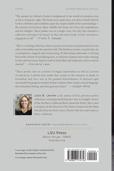 Struggling to accept her impending blindness, the speaker in Julia B. Levine's fifth collection of poetry, Ordinary Psalms, asks everyday life to help her learn how to see beyond appearances into fundamental truths. As she contemplates the loss of one friend to cancer and another to suicide, along with her own visual impairment, Levine holds the world "close as I needed / to see." Imagistic, lyrical, and at times imploring divine intervention from a god she does not know or trust, these poems curse and praise the extraordinary place we live in and are in danger of losing. Lamenting that "this world is a mortal affliction / with wounds in the beautiful," Ordinary Psalms provides a seductive and lyric rumination on radiance, loss, and grief.