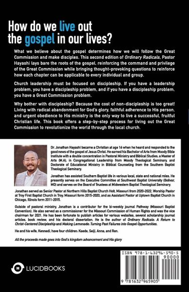 How do we live out the gospel in our lives? What we believe about the gospel determines how we will follow the Great Commission and make disciples. This second edition of Ordinary Radicals, Pastor Hayashi lays bare the roots of the gospel, reinforcing the command and privilege of the Great Commission while bringing thought-provoking questions to reinforce how each chapter can be applicable to every individual and group. Church leadership must be focused on discipleship. If you have a leadership problem, you have a discipleship problem, and if you have a discipleship problem, you have a Great Commission problem. Why bother with discipleship? Because the cost of non-discipleship is too great! Living with radical abandonment for God's glory, faithful adherence to His person, and urgent obedience to His ministry is the only way to live a successful, fruitful Christian life. This book offers a step-by-step process for living out the Great Commission to revolutionize the world through the local church.