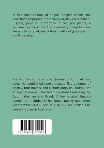 In this small volume of original English poems, award-winning Afrikaans poet Ilse van Staden finds inspiration in her everyday environment, in the small ordinary things of nature and home life.