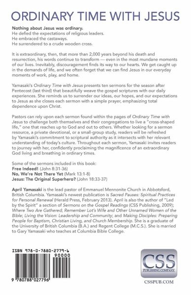 Nothing about Jesus was ordinary. He defied the expectations of religious leaders. He embraced the castaways. He surrendered to a crude wooden cross. It is extraordinary, then, that more than 2,000 years beyond his death and resurrection, his words continue to transform -- even in the most mundane moments of our lives. Inevitably, discouragement finds its way to our hearts. We get caught up in the demands of life, and we often forget that we can find Jesus in our everyday moments of work, play, and home. Yamasaki's Ordinary Time with Jesus presents ten Pentecost (last third) sermons that beautifully weave the gospel scriptures with our daily experiences. She reminds us to surrender our ideas, our hopes, and our expectations to Jesus as she closes each sermon with a simple prayer, emphasizing total dependence upon Christ. Pastors can rely upon each sermon found within the pages of Ordinary Time with Jesus to challenge both themselves and their congregations to live a "cross-shaped life," one that reaches up to God and out to others. Whether looking for a sermon resource, a private devotional, or a small-group study, readers will be refreshed by Yamasaki's commitment to scriptural authority as it intersects with her relevant understanding of today's culture. Throughout each sermon, Yamasaki invites readers to journey with her, confidently proclaiming the magnificence of an extraordinary God living and breathing in ordinary times. Some of the sermons included in this book: Free Indeed! (John 8:31-36) No, We're Not There Yet (Mark 13:1-8) Jesus: The Original Superhero? (John 18:33-37) April Yamasaki is the lead pastor of Emmanuel Mennonite Church in Abbotsford, British Columbia. Yamasaki's newest publication is Sacred Pauses: Spiritual Practices for Personal Renewal (Herald Press, February 2013). April is also the author of "Led by the Spirit" a section of Sermons on the Gospel Readings (CSS Publishing, 2009); Where Two Are Gathered; Remember Lot's Wife and Other Unnamed Women of the Bible; Living the Vision: Leadership and Community; and Making Disciples: Preparing People for Baptism, Christian Living, and Church Membership. She is a graduate of the University of British Columbia (B.A.) and Regent College (M.C.S.). She is married to Gary Yamasaki who teaches at Columbia Bible College.