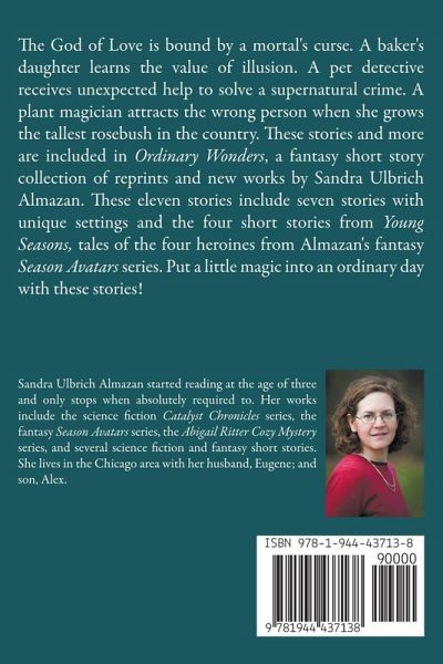The God of Love is bound by a mortal's curse. A baker's daughter learns the value of illusion. A pet detective receives unexpected help to solve a supernatural crime. A plant magician attracts the wrong person when she grows the tallest rosebush in the country. These stories and more are included in Ordinary Wonders, a fantasy short story collection of reprints and new works by Sandra Ulbrich Almazan. These eleven stories include seven stories with unique settings and the four short stories from Young Seasons, tales of the four heroines from Almazan's fantasy Season Avatars series. Put a little magic into an ordinary day with these stories!