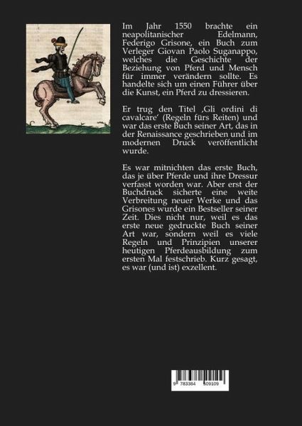 Im Jahr 1550 brachte ein neapolitanischer Edelmann, Federigo Grisone, ein Buch zum Verleger Giovan Paolo Suganappo, welches die Geschichte der Beziehung von Pferd und Mensch für immer verändern sollte. Es handelte sich um einen Führer über die Kunst, ein Pferd zu dressieren.Er trug den Titel 'Gli ordini di cavalcare' (Regeln fürs Reiten) und war das erste Buch seiner Art, das in der Renaissance geschrieben und im modernen Druck veröffentlicht wurde.Es war mitnichten das erste Buch, das je über Pferde und ihre Dressur verfasst worden war. Aber erst der Buchdruck sicherte eine weite Verbreitung neuer Werke und das Grisones wurde ein Bestseller seiner Zeit. Dies nicht nur, weil es das erste neue gedruckte Buch seiner Art war, sondern weil es viele Regeln und Prinzipien unserer heutigen Pferdeausbildung zum ersten Mal festschrieb. Kurz gesagt, es war (und ist) exzellent.Ein berühmtes Buch. Ein Klassiker.