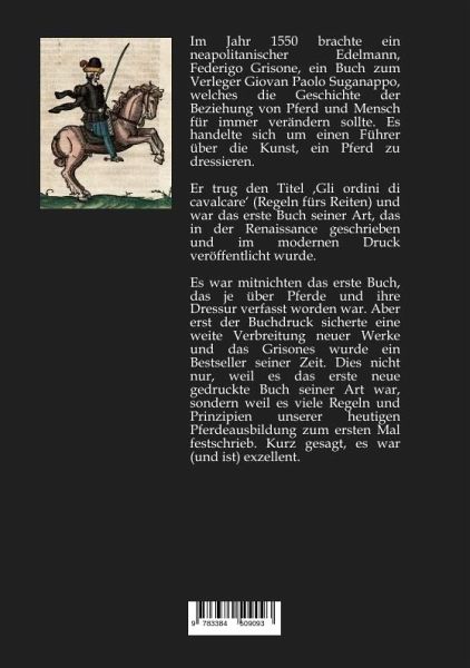 Im Jahr 1550 brachte ein neapolitanischer Edelmann, Federigo Grisone, ein Buch zum Verleger Giovan Paolo Suganappo, welches die Geschichte der Beziehung von Pferd und Mensch für immer verändern sollte. Es handelte sich um einen Führer über die Kunst, ein Pferd zu dressieren.Er trug den Titel 'Gli ordini di cavalcare' (Regeln fürs Reiten) und war das erste Buch seiner Art, das in der Renaissance geschrieben und im modernen Druck veröffentlicht wurde.Es war mitnichten das erste Buch, das je über Pferde und ihre Dressur verfasst worden war. Aber erst der Buchdruck sicherte eine weite Verbreitung neuer Werke und das Grisones wurde ein Bestseller seiner Zeit. Dies nicht nur, weil es das erste neue gedruckte Buch seiner Art war, sondern weil es viele Regeln und Prinzipien unserer heutigen Pferdeausbildung zum ersten Mal festschrieb. Kurz gesagt, es war (und ist) exzellent.Ein berühmtes Buch. Ein Klassiker.