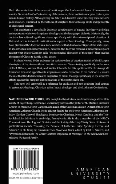 Nathan Howard Yoder evaluates the variant orders of creation models of the Erlangen theologians of the nineteenth and twentieth centuries. Concentrating specifically on the work of Paul Althaus, Werner Elert, and Walter Künneth, he lifts up Künneth's christological/trinitarian focus and appeal to sola scriptura as essential correctives to the tradition. He makes the case that the doctrine remains imperative to moral theology, specifically in the Church's efforts against the rampant antinomianism of the postmodern era.