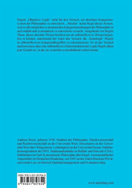 Hegels «Objektive Logik» steht für den Versuch, ein absolutes Kategoriensystem der Philosophie zu entwickeln. «Absolut» nennt Hegel dieses System, weil es alle möglichen systematischen Kategorienordnungen der Philosophie in sich enthält und systematisch zu entwickeln versucht. Ausgehend von Hegels These, dieses absolute Wissen letztlich nur als selbstreflexives Wissen begreifen zu können, unternimmt der Autor den Versuch, die «Seinslogik» Hegels in selbstreflexiven Kategorialbegriffen zu rekonstruieren. Es ist der Versuch nachzuweisen, dass eine selbstreflexive Dekonstruktion der Logik Hegels allein jene Gestalt sei, in der sie weiterhin systembildend wirken könne.