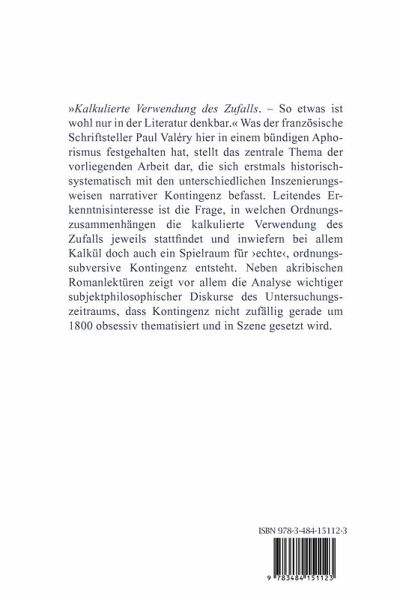 The modernist awareness of contingency is variously prefigured in German narrative discourse around 1800. In the course of the accounts of their lives, the characters in the novels »Agathon« (Wieland), »Siebenkäs« (Jean Paul), and »Godwi« (Brentano) are repeatedly confronted with coincidences befalling them, while the texts themselves are full of reflections indicating that the order and meaning they impose on the material could always have been different. The study examines the various modes of enactment employed in connection with narrative contingency, using the contingency concept to take a new perspective on the major literary epoch around 1800.