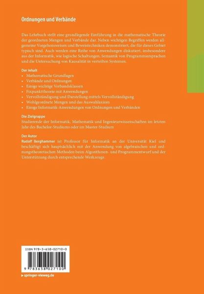 Das Lehrbuch stellt eine grundlegende Einführung in die mathematische Theorie der geordneten Mengen und Verbände dar. Neben wichtigen Begriffen werden allgemeine Vorgehensweisen und Beweistechniken demonstriert, die für dieses Gebiet typisch sind. Auch werden eine Reihe von Anwendungen diskutiert, insbesondere aus der Informatik, wie logische Schaltungen, Semantik von Programmiersprachen und die Untersuchung von Kausalität in verteilten Systemen.