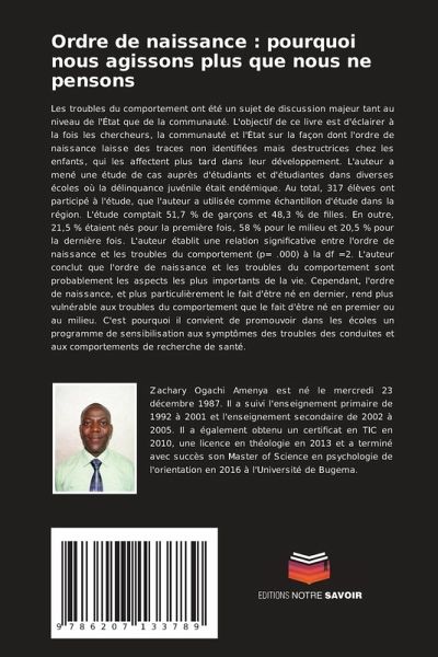 Les troubles du comportement ont été un sujet de discussion majeur tant au niveau de l'État que de la communauté. L'objectif de ce livre est d'éclairer à la fois les chercheurs, la communauté et l'État sur la façon dont l'ordre de naissance laisse des traces non identifiées mais destructrices chez les enfants, qui les affectent plus tard dans leur développement. L'auteur a mené une étude de cas auprès d'étudiants et d'étudiantes dans diverses écoles où la délinquance juvénile était endémique. Au total, 317 élèves ont participé à l'étude, que l'auteur a utilisée comme échantillon d'étude dans la région. L'étude comptait 51,7 % de garçons et 48,3 % de filles. En outre, 21,5 % étaient nés pour la première fois, 58 % pour le milieu et 20,5 % pour la dernière fois. L'auteur établit une relation significative entre l'ordre de naissance et les troubles du comportement (p= .000) à la df =2. L'auteur conclut que l'ordre de naissance et les troubles du comportement sont probablement les aspects les plus importants de la vie. Cependant, l'ordre de naissance, et plus particulièrement le fait d'être né en dernier, rend plus vulnérable aux troubles du comportement que le fait d'être né en premier ou au milieu. C'est pourquoi il convient de promouvoir dans les écoles un programme de sensibilisation aux symptômes des troubles des conduites et aux comportements de recherche de santé.