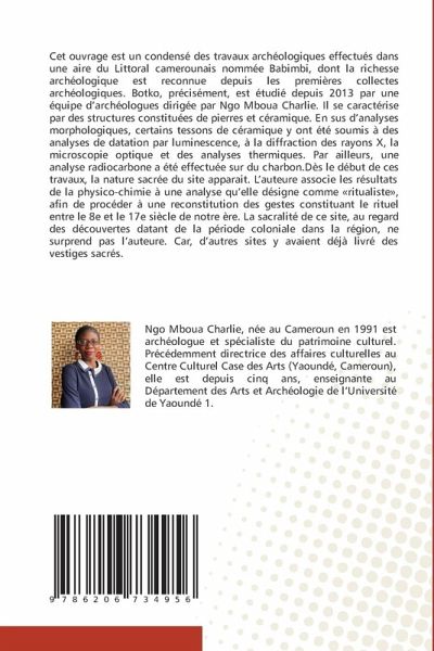 Cet ouvrage est un condensé des travaux archéologiques effectués dans une aire du Littoral camerounais nommée Babimbi, dont la richesse archéologique est reconnue depuis les premières collectes archéologiques. Botko, précisément, est étudié depuis 2013 par une équipe d'archéologues dirigée par Ngo Mboua Charlie. Il se caractérise par des structures constituées de pierres et céramique. En sus d'analyses morphologiques, certains tessons de céramique y ont été soumis à des analyses de datation par luminescence, à la diffraction des rayons X, la microscopie optique et des analyses thermiques. Par ailleurs, une analyse radiocarbone a été effectuée sur du charbon.Dès le début de ces travaux, la nature sacrée du site apparait. L'auteure associe les résultats de la physico-chimie à une analyse qu'elle désigne comme «ritualiste», afin de procéder à une reconstitution des gestes constituant le rituel entre le 8e et le 17e siècle de notre ère. La sacralité de ce site, au regard des découvertes datant de la période coloniale dans la région, ne surprend pas l'auteure. Car, d'autres sites y avaient déjà livré des vestiges sacrés.