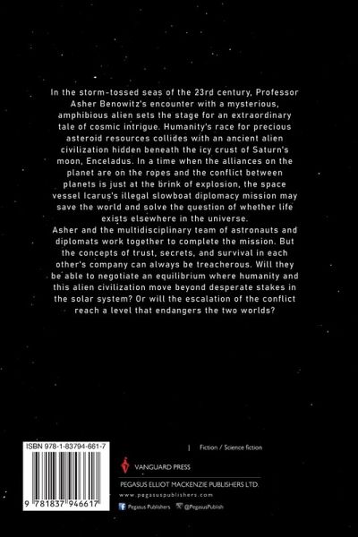 In the storm-tossed seas of the 23rd century, Professor Asher Benowitz's encounter with a mysterious, ¿amphibious alien sets the stage for an extraordinary tale of cosmic intrigue. Humanity's race for ¿precious asteroid resources collides with an ancient alien civilization hidden beneath the icy crust of ¿Saturn's moon, Enceladus. In a time when the alliances on the planet are on the ropes and the conflict ¿between planets is just at the brink of explosion, the space vessel Icarus's illegal slowboat diplomacy ¿mission may save the world and solve the question of whether life exists elsewhere in the universe. Asher and the multidisciplinary team of astronauts and diplomats work together to complete the ¿mission. But the concepts of trust, secrets, and survival in each other's company can always be ¿treacherous. Will they be able to negotiate an equilibrium where humanity and this alien civilization ¿move beyond desperate stakes in the solar system? Or will the escalation of the conflict reach a level ¿that endangers the two worlds?