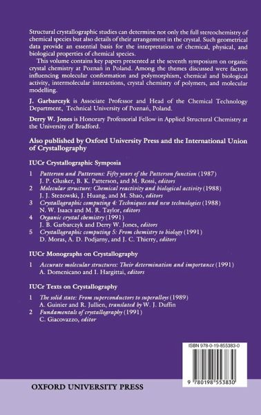 Introduction: Current topics in organic crystal chemistry; Polymorphism and the investigation of structure-property relations in organic solids; Werner clathrates: Guest-lattice interactions in MIIX2A4 complexes; Modelling steroid hormone receptor interactions on the basis of crystallographic and biochemical studies; Crystallographic studies of inter- and intra-molecular interactions; The effect of solvent-surface interactions on crystal growth and dissolution; Intermolecular interactions in the crystals of simple cyclic b-diketoalkanes; Strain in cyclo-annulated aromatic systems; Stereochemistry of methyl and methoxy substituents in polycyclic hydrocarbons; The relations between S-O hypervalent bonds and S...O close contacts in crystal structures of sulfuranes, analogous sulfonium salts and related compounds containing X-S...O(X=S, C1, O, N, C) moeities; ISIS: A powerful new tool for organic crystal chemistry; Aryloxide-aluminium II-bonding in the II-face selectivity of co-ordinated ketones towards nucleophilic attack; Cation-anion interactions in crystalline quininium salts; Influence of electric field on polymorphism in isotactic polypropylene; Organic crystal chemistry in the 1990's.