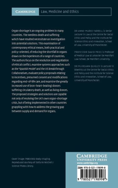 Organ shortage is an ongoing problem in many countries. The needless death and suffering which have resulted necessitate an investigation into potential solutions. This examination of contemporary ethical means, both practical and policy-oriented, of reducing the shortfall in organs draws on the experiences of a range of countries. The authors focus on the resolution and negotiation of ethical conflict, examine systems approaches such as the 'Spanish model' and the US Breakthrough Collaboratives, evaluate policy proposals relating to incentives, presumed consent, and modifications regarding end-of-life care, and evaluate the greatly increased use of (non-heart-beating) donors suffering circulatory death, as well as living donors. The proposed strategies and solutions are not only capable of resolving the UK's own organ-shortage crisis, but also of being implemented in other countries grappling with how to address the growing gap between supply and demand for organs.