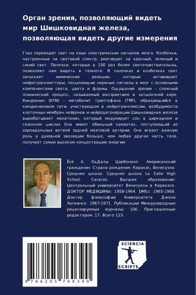 Glaz perewodit swet na qzyk älektricheskih signalow mozga. Kolbochki, nastroennye na swetowoj spektr, reagiruüt na krasnyj, zelenyj i sinij swet. Palochki, kotorye w 100 raz bolee swetochuwstwitel'ny, pozwolqüt nam widet' w temnote. V palochkah i kolbochkah swet zapuskaet himicheskie reakcii, kotorye aktiwiruüt nejrotransmittery, posylaüschie nerwnye signaly w mozg s osnownymi komponentami sweta, cweta i formy. Oschuschenie zreniq - slozhnyj psihicheskij process, nazywaemyj wospriqtiem w zatylochnoj kore. Kinurenin (KYN) - metabolit triptofana (TRP), obrazuüschijsq w kinureninowom puti, uchastwuüschem w nejrotransmissii, wozbudimosti kletochnyh membran nejronow i nejrodegeneracii Shishkowidnaq zheleza wyrabatywaet melatonin, kotoryj moduliruet son w cirkadnom i sezonnom ciklah Ona imeet obil'nyj krowotok, postupaüschij iz horoidal'nyh wetwej zadnej mozgowoj arterii. Ona igraet wazhnuü rol' w duhownoj äwolücii bol'she, chem lübaq drugaq chast' tela, poluchaet samuü wysokuü koncentraciü änergii.